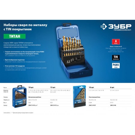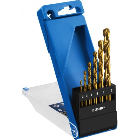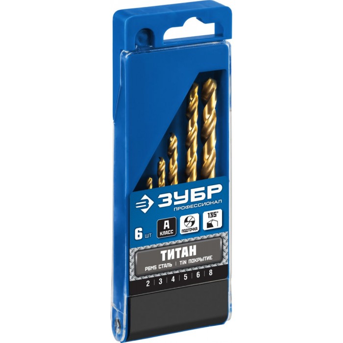 Набор сверл по металлу 6 шт (2-8 мм), сталь Р6М5, класс А, титановое покрытие ЗУБР ТИТАН Профессионал 29615-H6