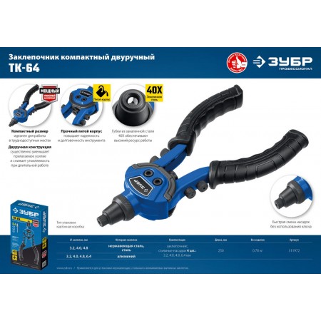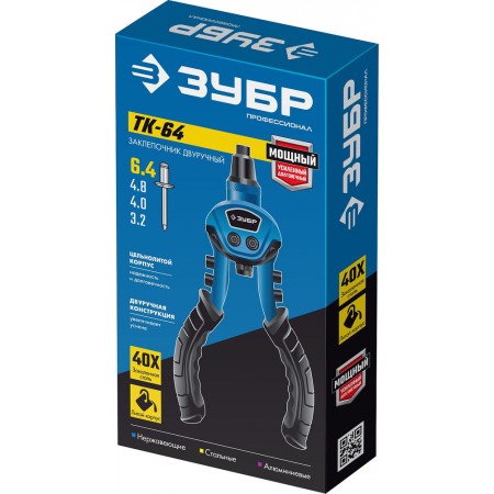 Применяется для установки вытяжных заклепок. Используется с нержавеющими заклепками 2.4, 3.2, 4.0, 4.8 мм, стальными и алюминиевыми заклепками 2.4, 3.2, 4.0, 4.8, 6.4 мм Способ применения: 1. Просверлите отверстие 2. Установите заклепку в заклепочник, а затем в отверстие 3. Сжимайте и разжимайте рукоятки заклепочника до момента откусывания хвостовика заклепки 4. Заклепка установлена