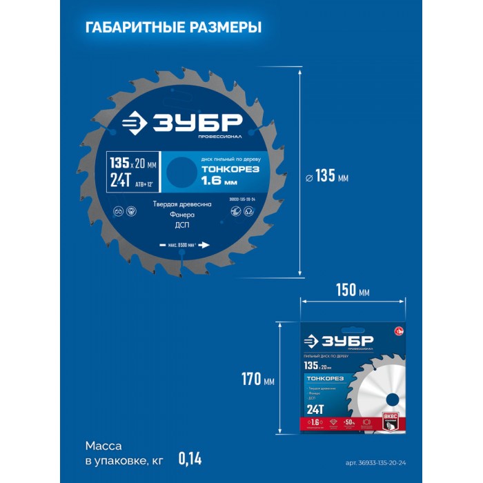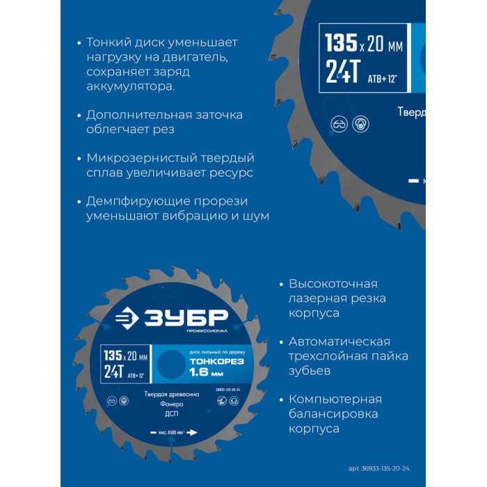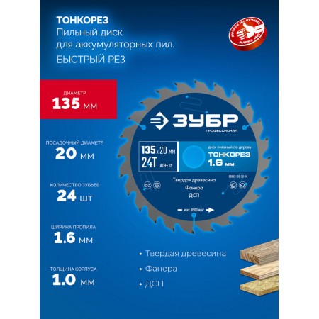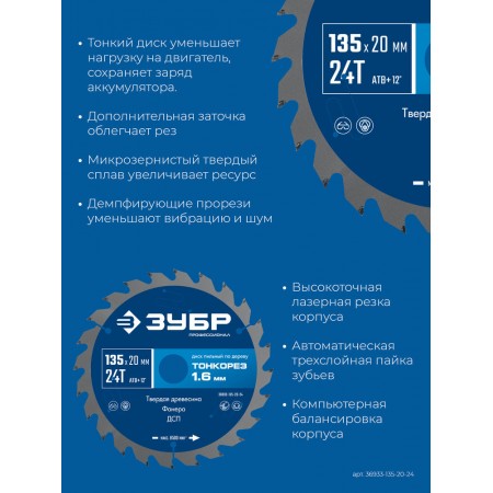 Диск пильный по дереву тонкий рез 135 x 20 x 1.4 мм, 24Т ЗУБР Тонкорез Профессионал 36933-135-20-24