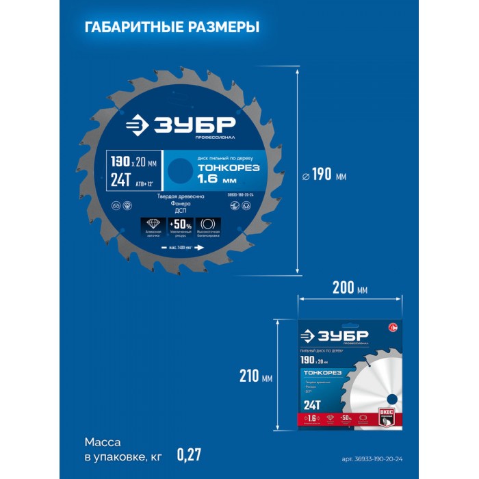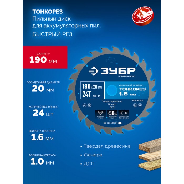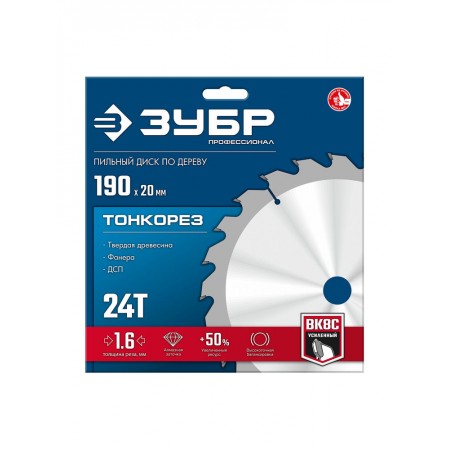 Диск пильный по дереву тонкий рез 190 x 20 x 1.6 мм, 24Т ЗУБР Тонкорез Профессионал 36933-190-20-24