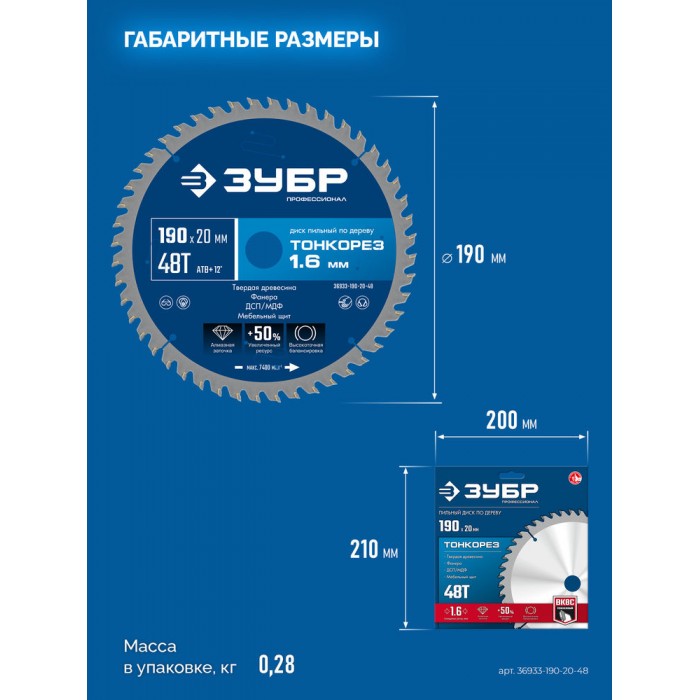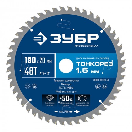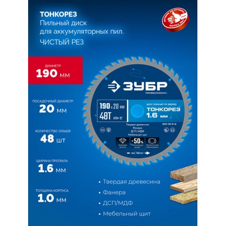 Диск пильный по дереву тонкий рез 190 x 20 x 1.6 мм, 48Т ЗУБР Тонкорез Профессионал 36933-190-20-48