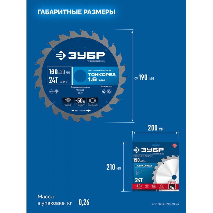 Диск пильный по дереву тонкий рез 190 x 30 x 1.6 мм, 24Т ЗУБР Тонкорез Профессионал 36933-190-30-24
