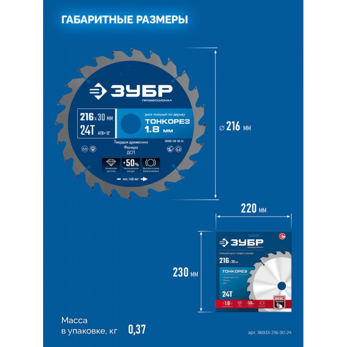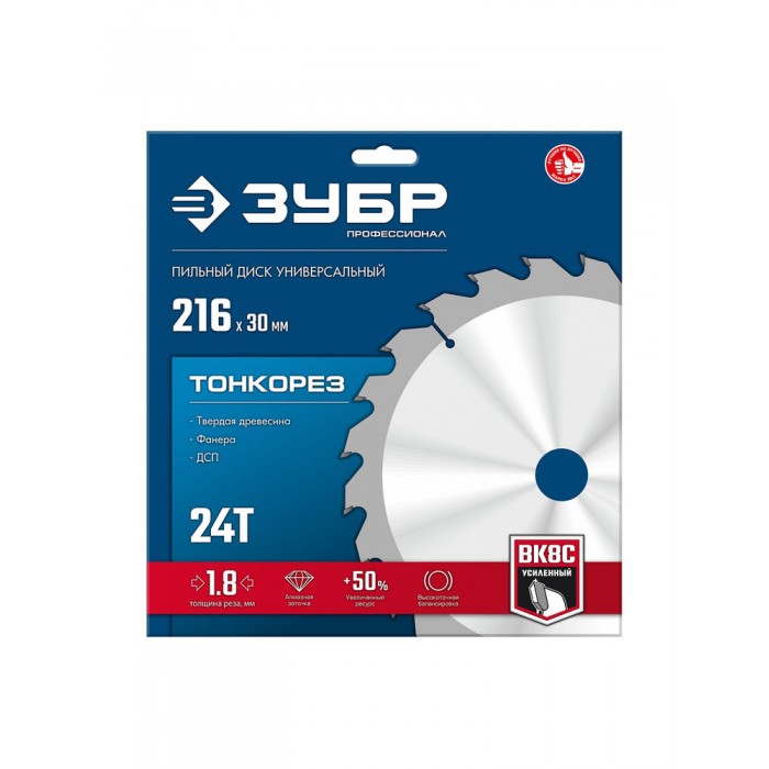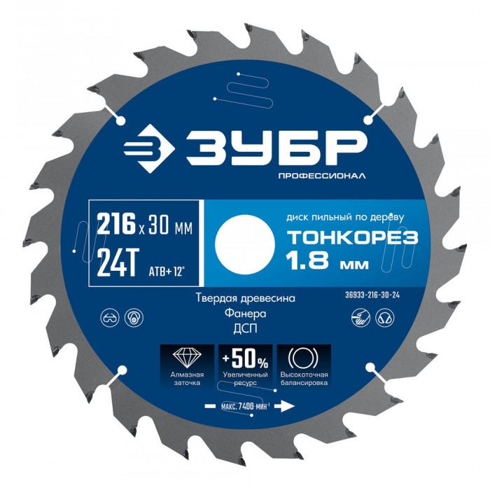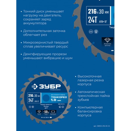 Диск пильный по дереву тонкий рез 216 x 30 x 1.8 мм, 24Т ЗУБР Тонкорез Профессионал 36933-216-30-24