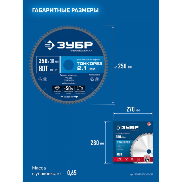 Диск пильный по дереву тонкий рез 250 x 30 x 2.1 мм, 80Т ЗУБР Тонкорез Профессионал 36933-250-30-80