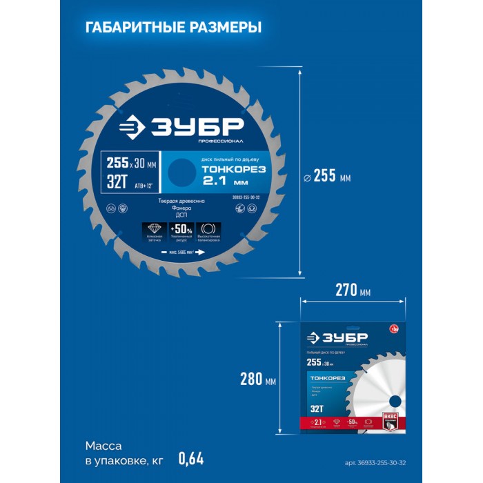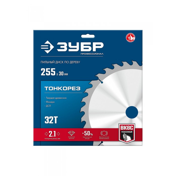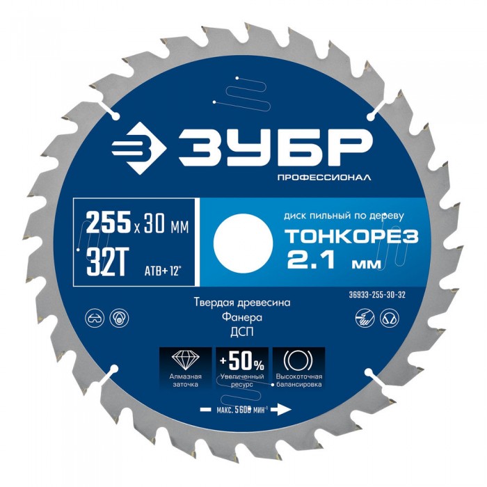 Диск пильный по дереву тонкий рез 255 x 30 x 2.1 мм, 32Т ЗУБР Тонкорез Профессионал 36933-255-30-32