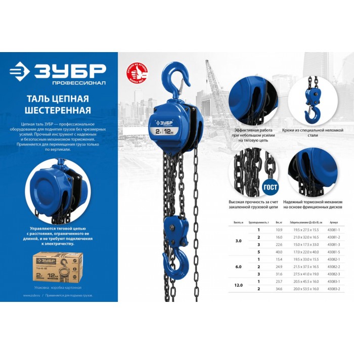 Таль ручная цепная шестеренная 1 т, 3 м ЗУБР ТШ-1-3 Профессионал 43081-1_z01