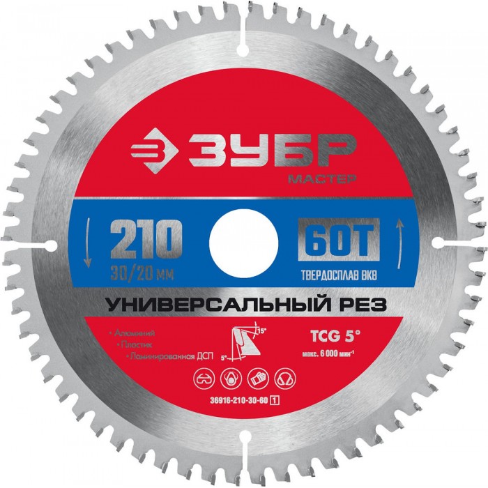 Диск пильный по алюминию 210 x 30/20 мм, 60Т ЗУБР Универсальный рез 36916-210-30-60_z01