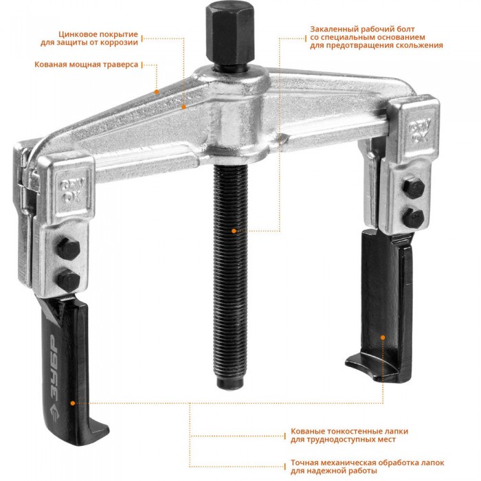 Захваты съемника выкованы из качественной инструментальной стали, что обеспечивает долгий срок службы при работе с высокими нагрузками. Позволяет работать с широким рядом узлов. Уменьшенные по толщине захваты дают возможность работать в условиях ограниченного пространства.