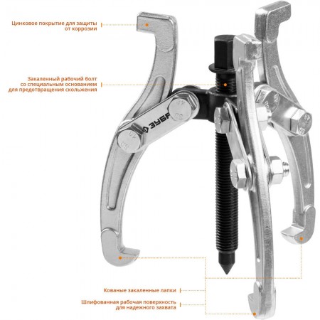 Захваты съемника выкованы из качественной инструментальной стали, что обеспечивает долгий срок службы при работе с высокими нагрузками. Позволяет работать с широким рядом узлов