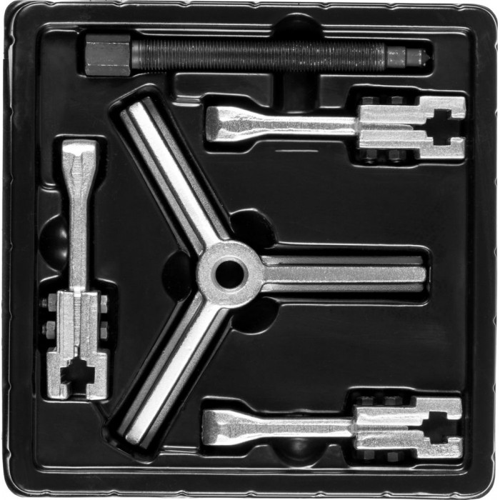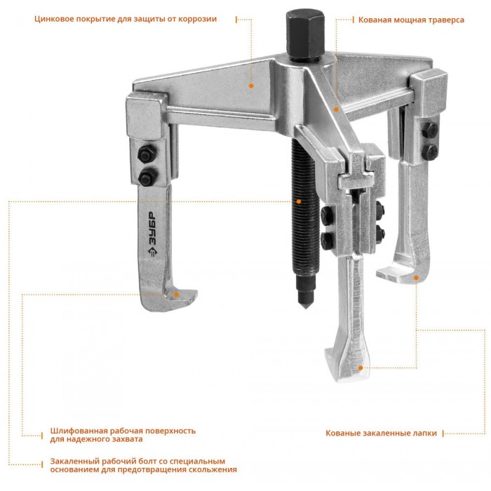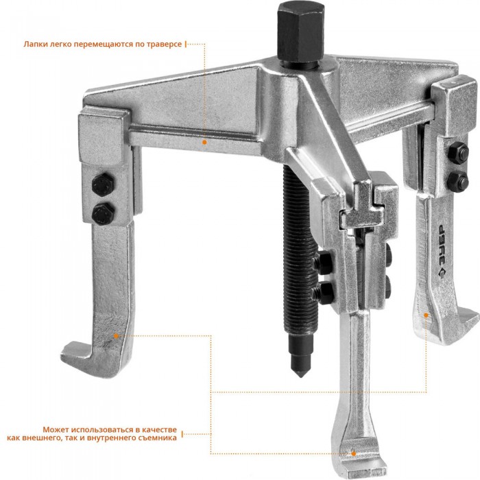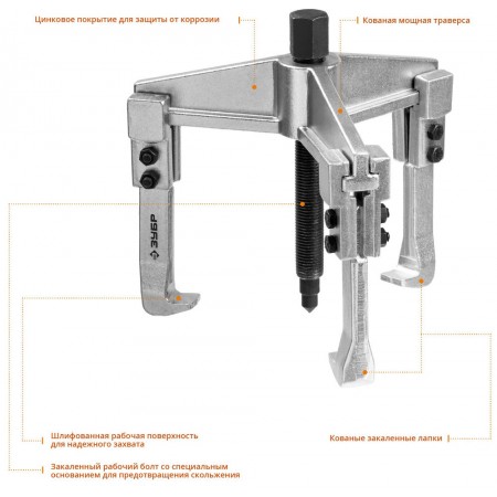 Захваты съемника выкованы из качественной инструментальной стали, что обеспечивает долгий срок службы при работе с высокими нагрузками. Позволяет работать с широким рядом узлов