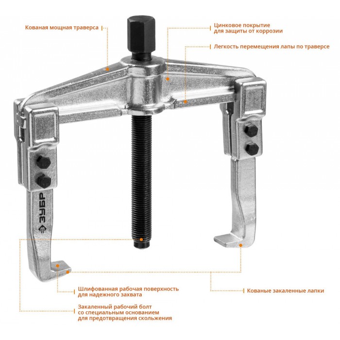 Захваты съемника выкованы из качественной инструментальной стали, что обеспечивает долгий срок службы при работе с высокими нагрузками. Позволяет работать с широким рядом узлов