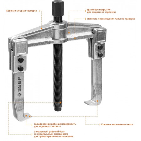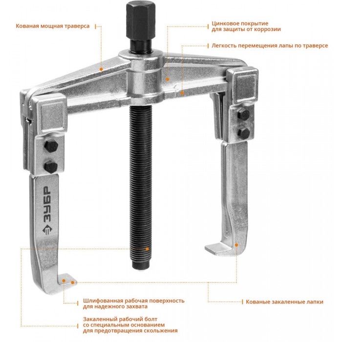 Захваты съемника выкованы из качественной инструментальной стали, что обеспечивает долгий срок службы при работе с высокими нагрузками. Позволяет работать с широким рядом узлов
