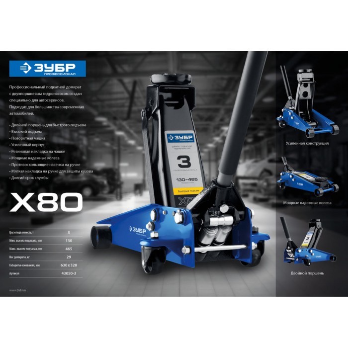 - Домкрат обладает двухпоршневым гидронасосом для быстрого подъема груза.