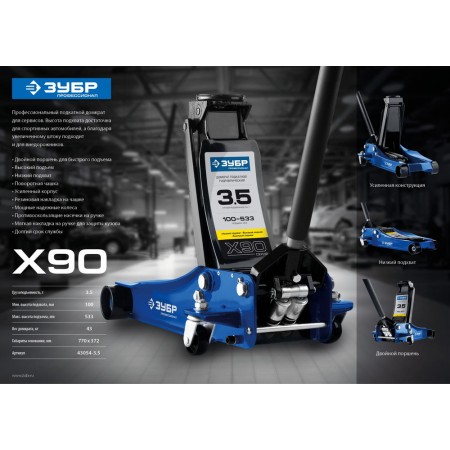 Профессиональный подкатной домкрат для СТО с низкой высотой подхвата всего 100 мм подойдет для всех типов легковых автомобилей, включая спортивные с небольшим клиренсом. Высокая грузоподъемность и высота подъема также позволяет обслуживать внедорожники и кроссоверы. Двойной гидронасос обеспечивает высокую скорость подъема при проведении регламентных и ремонтных работ.