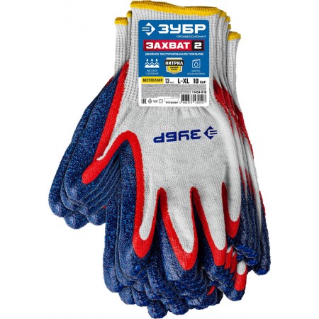 Перчатки х/б ЗАХВАТ-2 L-XL с двойным текстурированным нитриловым обливом, повышенная износостойкость, 13 класс, 10 пар ЗУБР Профессионал 11454-K10