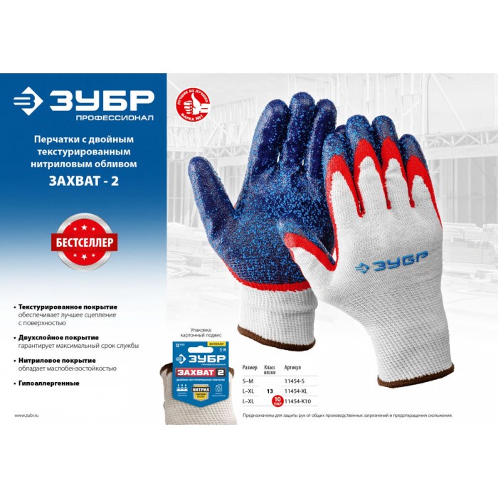 Перчатки х/б ЗАХВАТ-2 L-XL с двойным текстурированным нитриловым обливом, повышенная износостойкость, 13 класс ЗУБР Профессионал 11454-XL