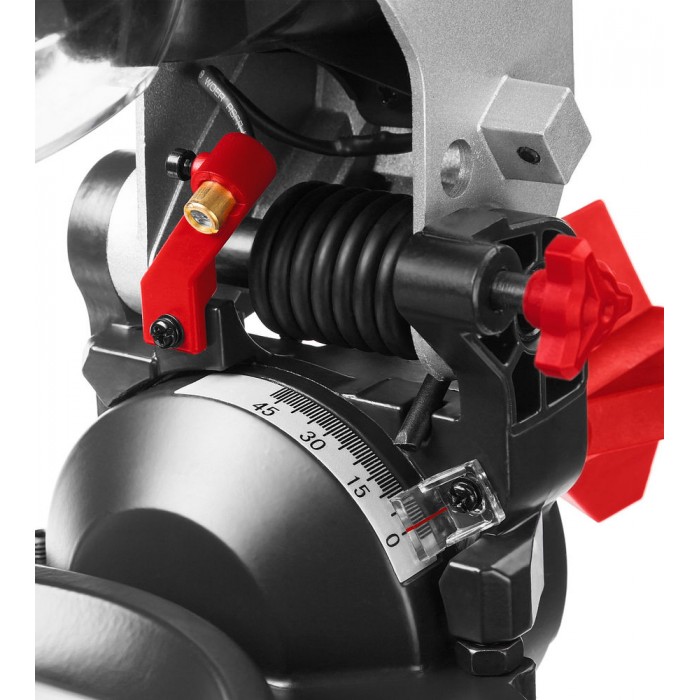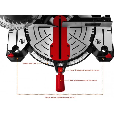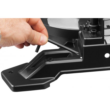 - Фиксирующийся в любом положении поворотный стол и удобная регулировка наклона облегчают установку угла пиления