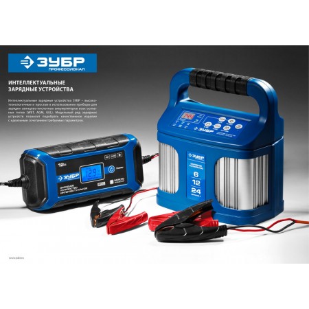 Интеллектуальное зарядное устройство предназначено для зарядки аккумуляторных батарей легковых и грузовых автомобилей, мотоциклов, снегоходов, катеров (лодок), газонокосилок, тракторов, гидроциклов и т.д. Зарядные устройства ЗУБР управляются с помощью микропроцессора. Данные устройства обладают высокой эффективностью и имеют защиту от ошибок, которые может допустить пользователь. Микропроцессор зарядного устройства оценивает состояние батареи и соответствующим образом устанавливает силу зарядного тока и напряжение (в зависимости от типа АКБ и её состояния). Это позволяет наиболее эффективно зарядить аккумулятор и продлить срок его службы.