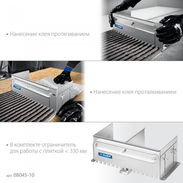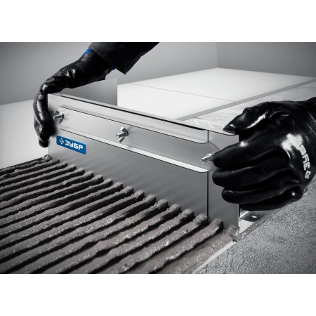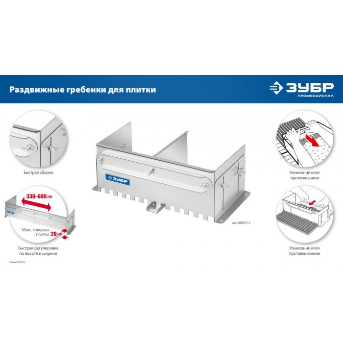 Предназначена для быстрой работы с большим объемом работ по укладке плитки шириной до 600мм. Сделана изоцинкованной стали, благодаря которой гребенка не заржавеет и прослужит максимально долго. Имеет величину зуба 10мм. Боковые регуляторы помогут закрепить гребенку на рабочей поверхности и настроить её по высоте под любую плитку. В комплекте имеется дополнительная секция, благодаря которой гребенку можно использовать даже с самыми узкими плитками. Легко моется, не боится влаги.